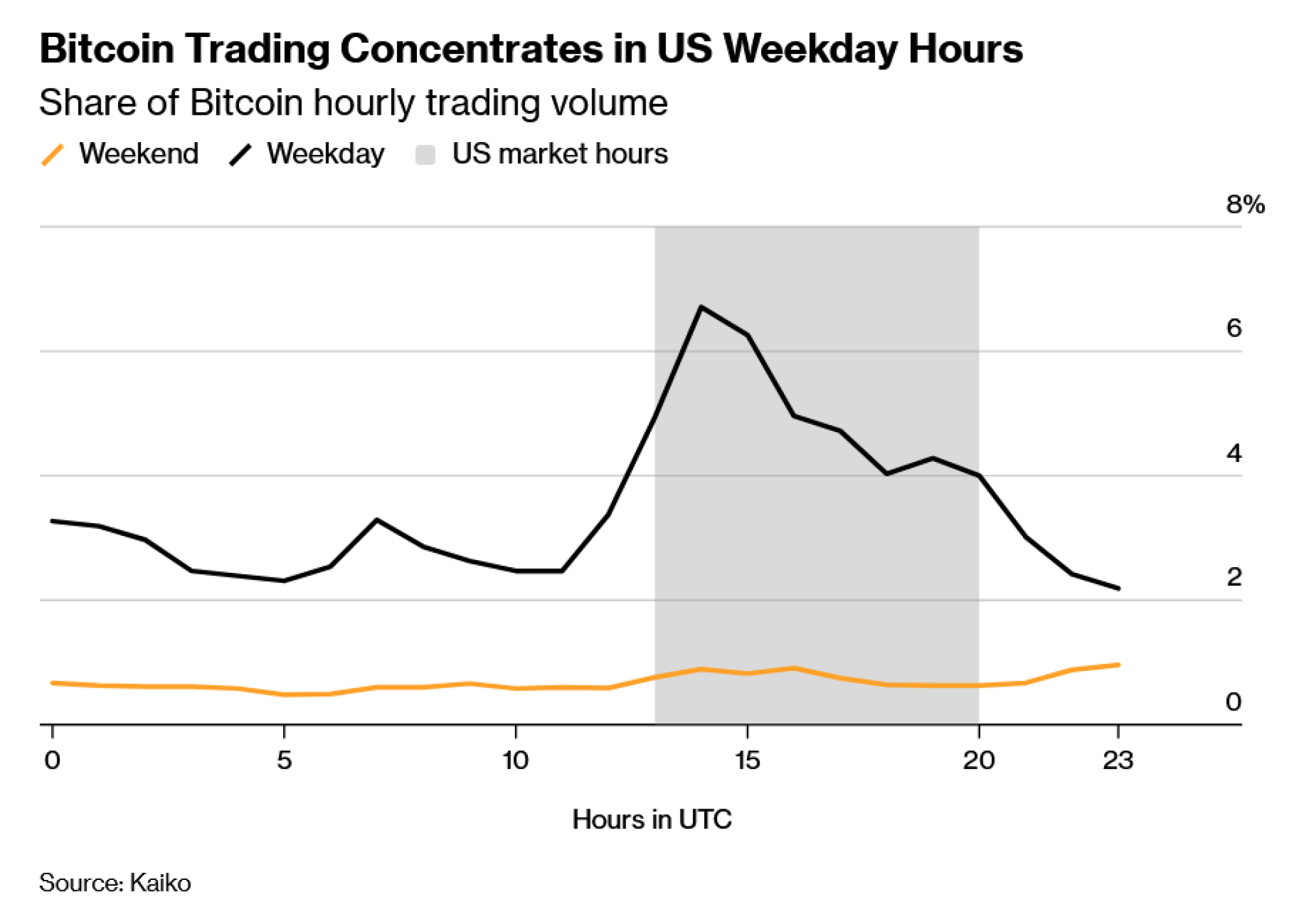 Od pokretanja američkih spot bitcoin ETF-ova, institucionalno trgovanje se grupiralo oko petodnevnog radnog vremena tržišta dionica od šest i pol sati dnevno. Formiranje cijena, hedging i korištenje financijske poluge uskladili su se s tim radnim vremenom. Rizik se sada aktivno procjenjuje tijekom američkog trgovanja, kada su tržišta ETF-ova i derivata otvorena, a likvidnost najveća.