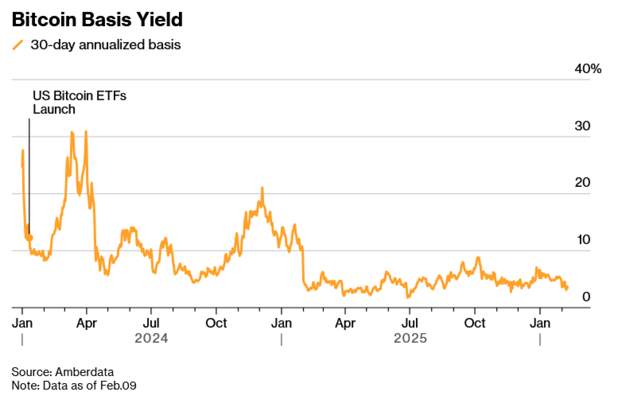 Mjesecima nakon što su bitcoin ETF-ovi prvi put odobreni, godišnji prinosi na tu strategiju često su dosezali dvoznamenkaste iznose, ali od 9. veljače su pali na oko četiri posto nakon jer je preveliki broj sudionika na tržištu iscrpio mogućnost arbitraže, prema tvrtki Amberdata.