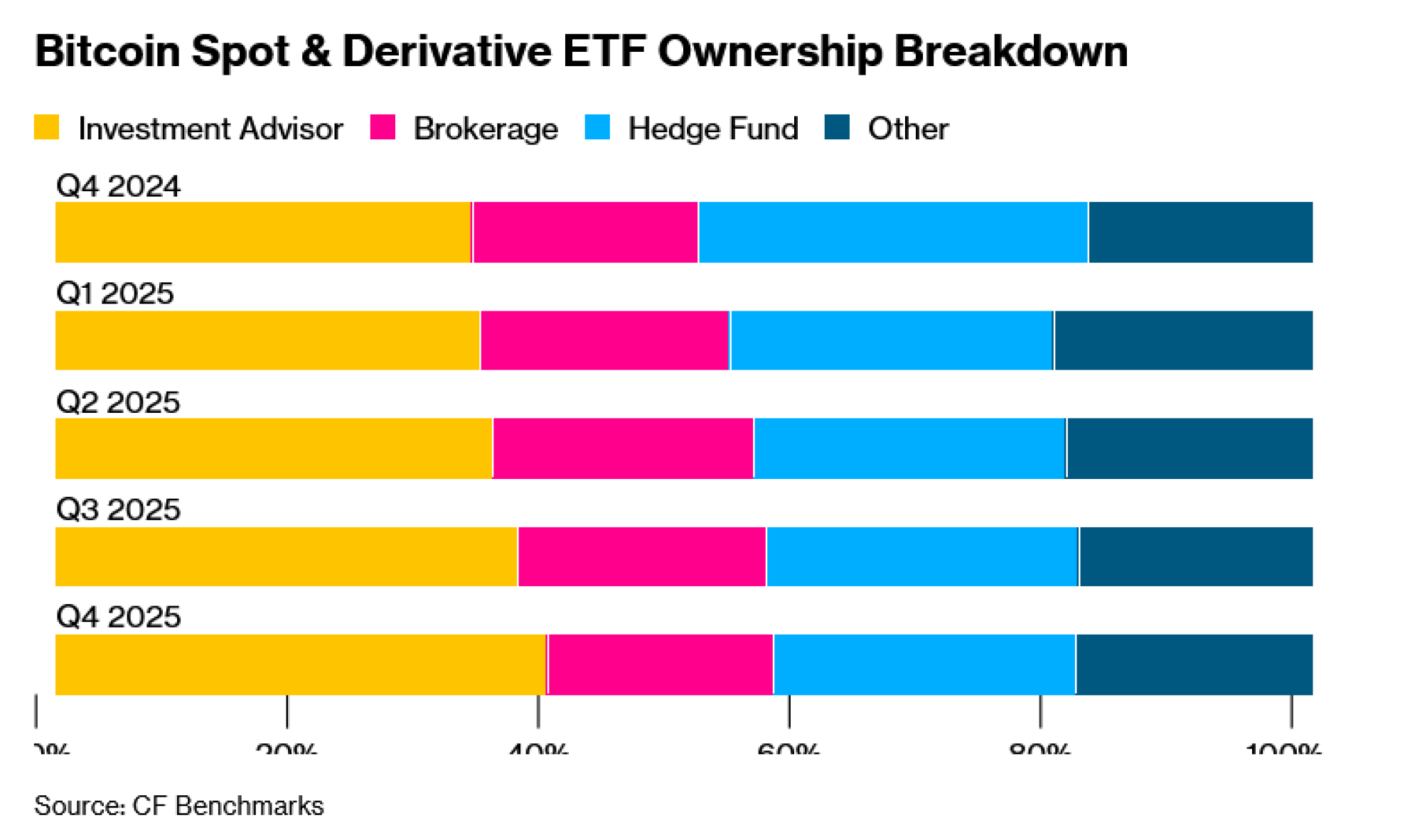 Podaci tvrtke CF Benchmarks pokazuju da su investicijski savjetnici povećavali svoje ukupne IBIT pozicije svakog tromjesečja tijekom protekle godine, što je rezultiralo porastom od 145 posto u odnosu na prethodnu godinu. Oni bi mogli predstavljati stabilniji izvor kapitala jer takve tvrtke "obično ne trguju na temelju kratkoročne volatilnosti", napisao je Selby.