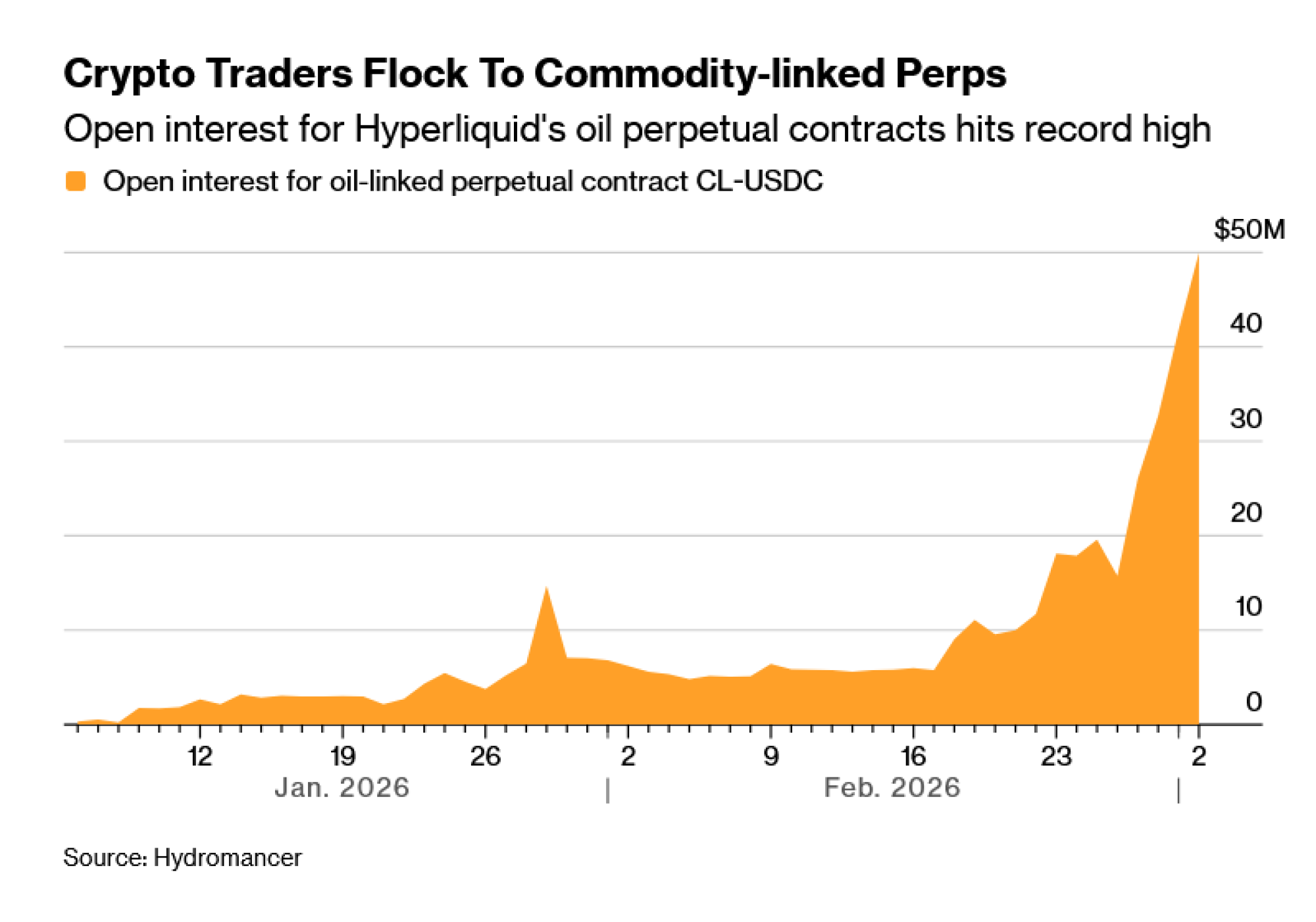 Posljednjih mjeseci, kako su zlato i srebro rasli, crypto-native trgovci okrenuli su se ugovorima vezanim za sirovine, koristeći ih za praćenje trendova ili izražavanje makroekonomskih stavova bez napuštanja kripto platformi. Otvoreni interes za te proizvode stalno raste, čak i ako je u apsolutnom iznosu i dalje skroman. Volumen trgovanja za jedan perpetual future vezan za srebro dosegnuo je ukupno 28,28 milijardi dolara na Hyperliquidu, prema podacima koje je prikupio Hydromancer. Perpetual future vezan za naftu, koji je postao dostupan početkom siječnja, otad je zabilježio promet od gotovo 400 milijuna dolara.