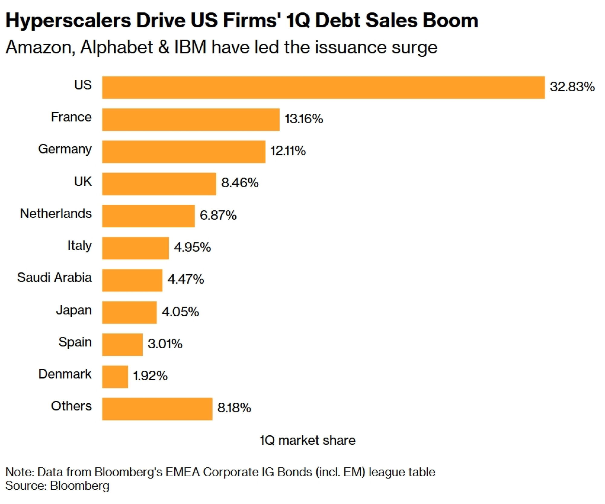 Tehnološki divovi predvode aktivnosti u Europi, pri čemu Alphabet Inc. i International Business Machines Corp. (IBM) zauzimaju drugo, odnosno treće mjesto na ljestvici iza Amazona, nakon golemih transakcija posljednjih tjedana. Ovaj trio drži više od 18 posto zajedničkog udjela u korporativnim izdanjima regije u prvom tromjesečju, pokazuje ljestvica.