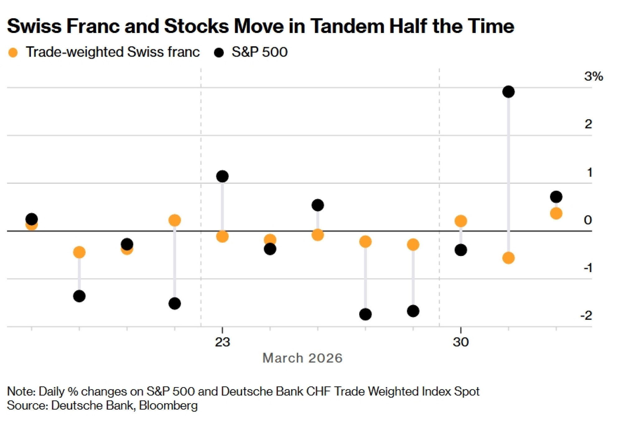 Valuta je pratila kretanje dionica: rasla je usporedno s dionicama u srijedu i padala s njima rano u četvrtak. Franak i indeks S&P 500 kretali su se usklađeno u sedam od posljednjih 12 sesija.