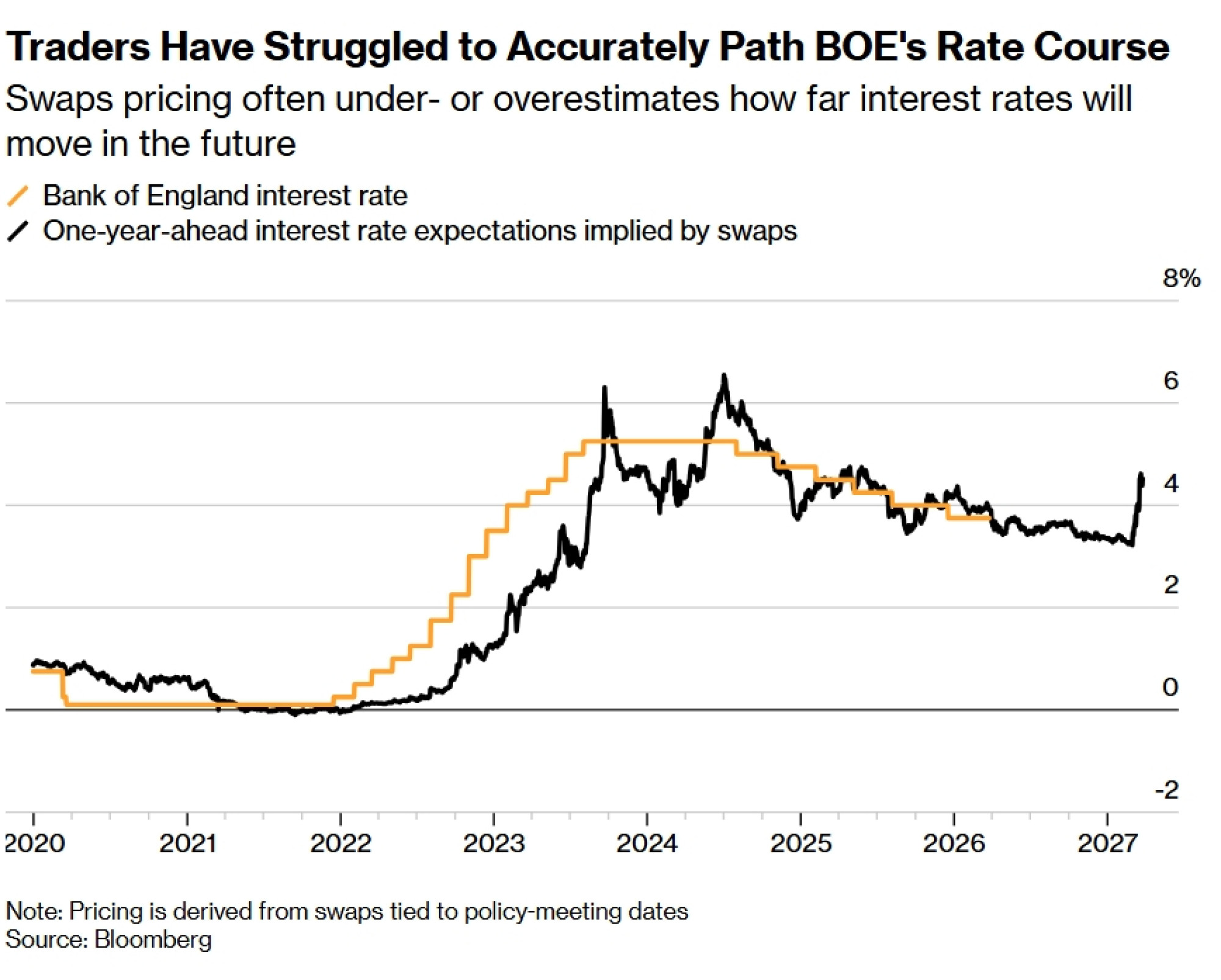 To ne znači da taj kolektivni stav treba uzimati zdravo za gotovo. Cijene na tržištu swapova često ne uspijevaju točno predvidjeti puni opseg i brzinu stvarnih promjena kamatnih stopa. Gledajući, na primjer, reakciju Ujedinjenog Kraljevstva na pandemiju, jasno je da su trgovci sporo predviđali koliko će povećanja stopa biti potrebno za hlađenje inflacije, a zatim su pretjerali u svojim očekivanjima kada su se stope stabilizirale.
