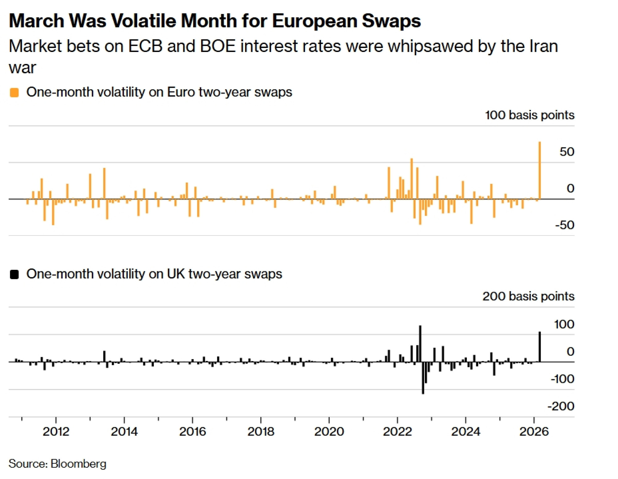 Neizvjesnost potiče volatilnost na tržištima kamatnih swapova, gdje se trgovci klade na iduće poteze središnjih banaka. Oklade na kamatne stope u SAD-u i Europi divlje osciliraju, mijenjajući se iz minute u minutu dok se sukob na Bliskom istoku nastavlja.