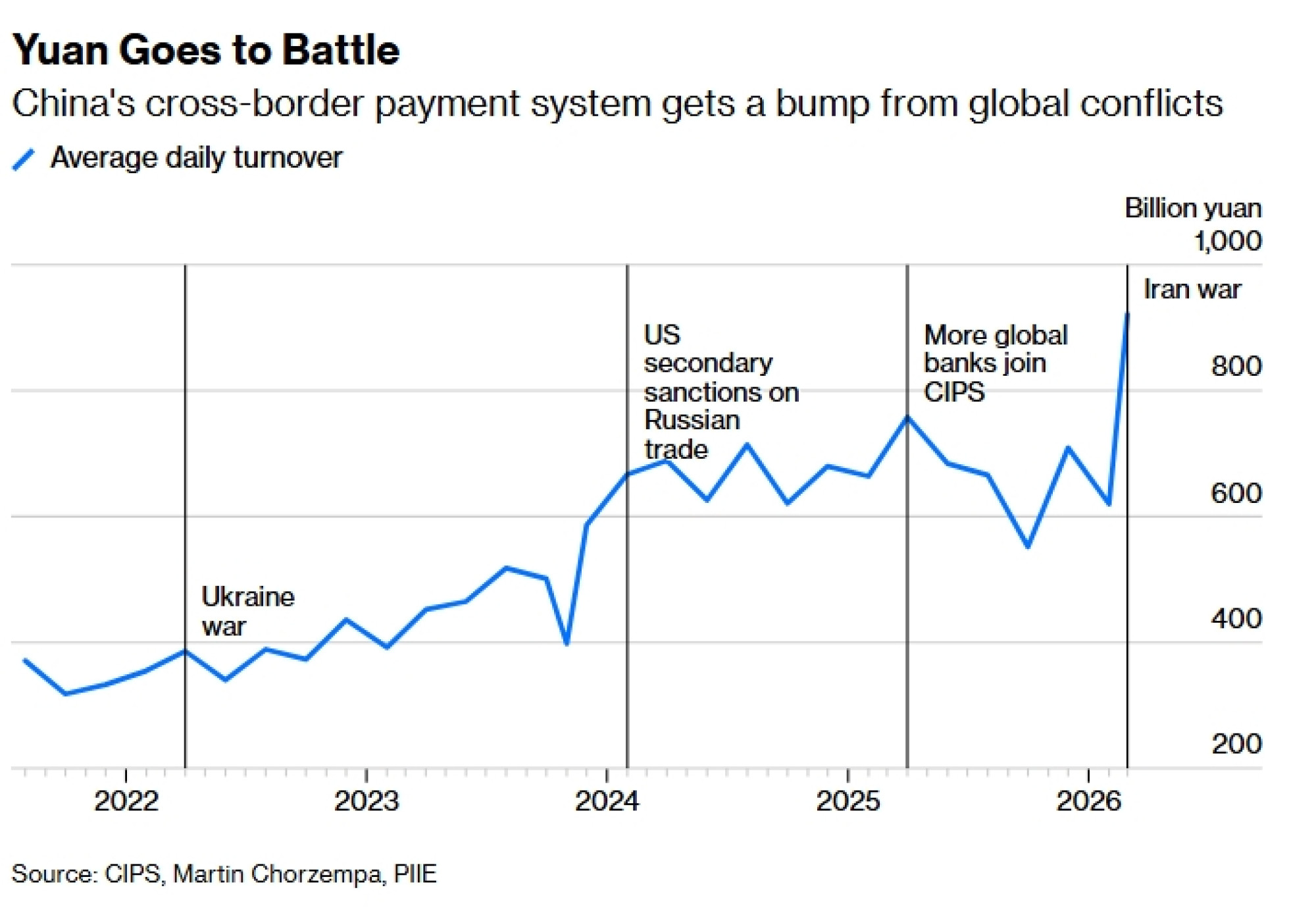 Iako je to tek djelić od 2,2 bilijuna dolara koliko prođe kroz New York, rast alternativne mreže vrijedan je pažnje. Podaci otkrivaju izvanrednu transformaciju, potaknutu strukturnim i geopolitičkim pomacima. U 2021. godini, Cips je bio tiha komunalna usluga s prosječnim dnevnim prometom od oko 350 milijardi juana. Do početka 2024. probio je granicu od 600 milijardi juana.