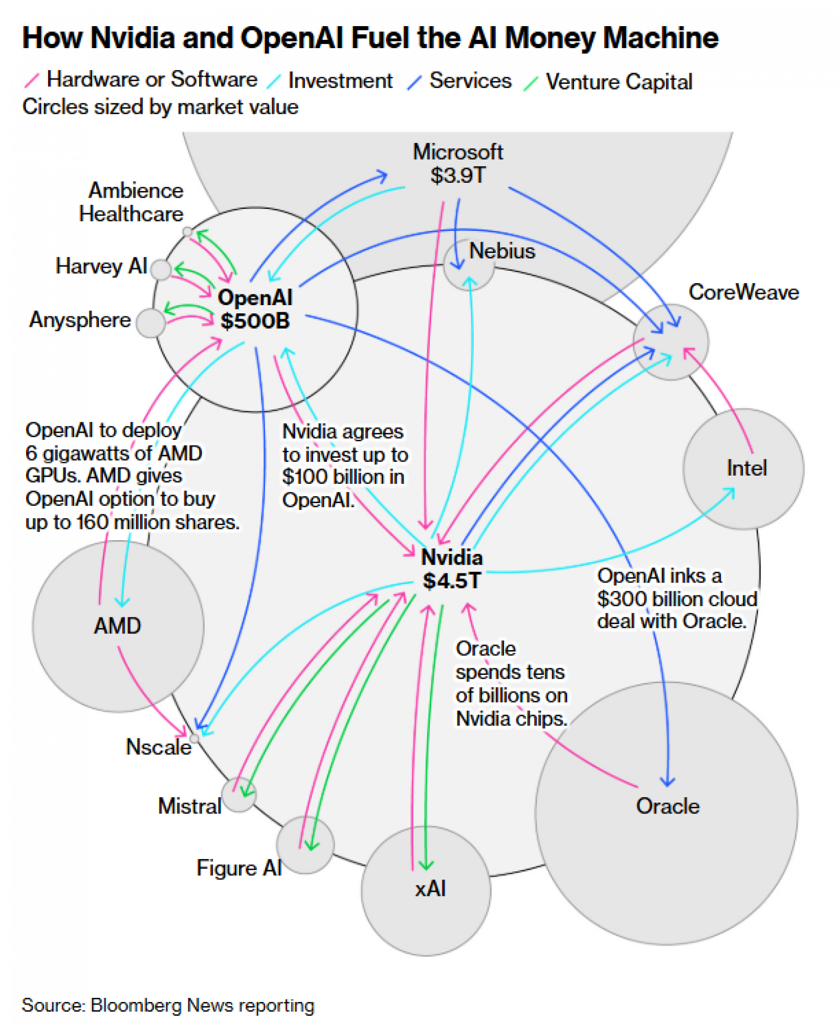 Tvrtke koje su prije tri godine potaknule investicijsku maniju u umjetnu inteligenciju bile su ključne u njezinu održavanju, potpisujući velike i ponekad preklapajuće ugovore s pružateljima cloud usluga, AI developerima i drugim startupima u tom sektoru. U tom su procesu postale ključni čimbenici koji povećavaju rizik mogućeg AI balona, napuhujući tržište i međusobno povezujući sudbine brojnih kompanija. Sam OpenAI sada je sklopio AI računalne ugovore s Nvidijom, AMD-om i Oracle Corp.-om, koji bi zajedno lako mogli premašiti jedan bilijun dolara. U međuvremenu, AI startup troši gotovinu velikom brzinom i ne očekuje pozitivne novčane tokove sve do kraja desetljeća.