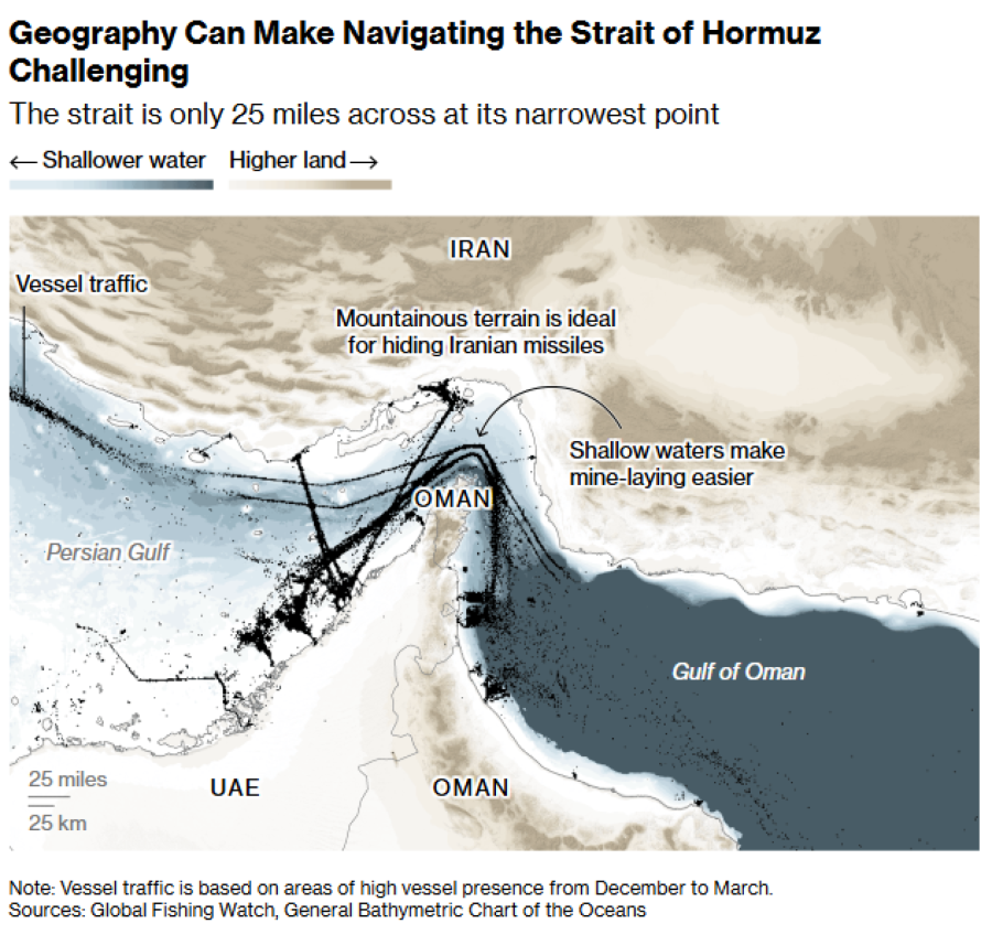 Hormuz nije jedina svjetska trgovinska uska grla. Tu su i Malajski tjesnac, Panamski kanal te uski prolaz u Crveno more između Jemena i Džibutija. No Hormuz je vjerojatno najvažniji koridor za energetsku industriju, kroz koji prolazi oko četvrtine svjetske pomorske trgovine naftom i petina opskrbe ukapljenim prirodnim plinom. Ne postoji alternativni pomorski put kojim bi se Hormuz zaobišao. Njegova lokacija u nestabilnoj i politički volatilnoj regiji, kao i jedinstvena topografija, čine ga posebno ranjivim na poremećaje.