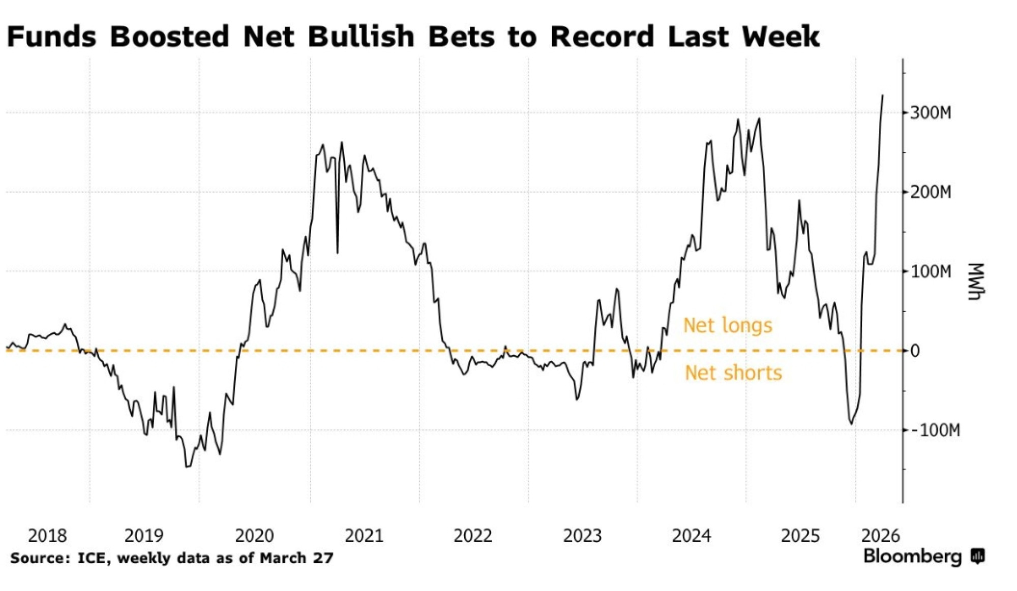 Neto "bikovske" oklade koje drže fondovi skočile su prošlog tjedna za 13 posto, nastavljajući uspon koji je započeo u veljači, prema podacima koje je u srijedu objavio Intercontinental Exchange Inc. Dosegnule su najvišu razinu u ICE podacima koje prikuplja Bloomberg od 2018. godine.
