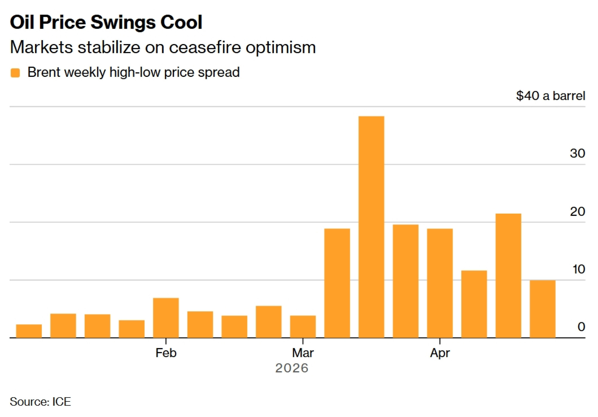 Nakon razdoblja iznimno volatilnog trgovanja, kretanja cijena su se smirila, pri čemu se Brentom ovaj tjedan trgovalo u rasponu od oko 10 dolara po barelu, u usporedbi s rekordnih 38 dolara sredinom ožujka. Pokazatelj volatilnosti ugovora za drugi mjesec bio je blizu najniže razine od početka prošlog mjeseca.