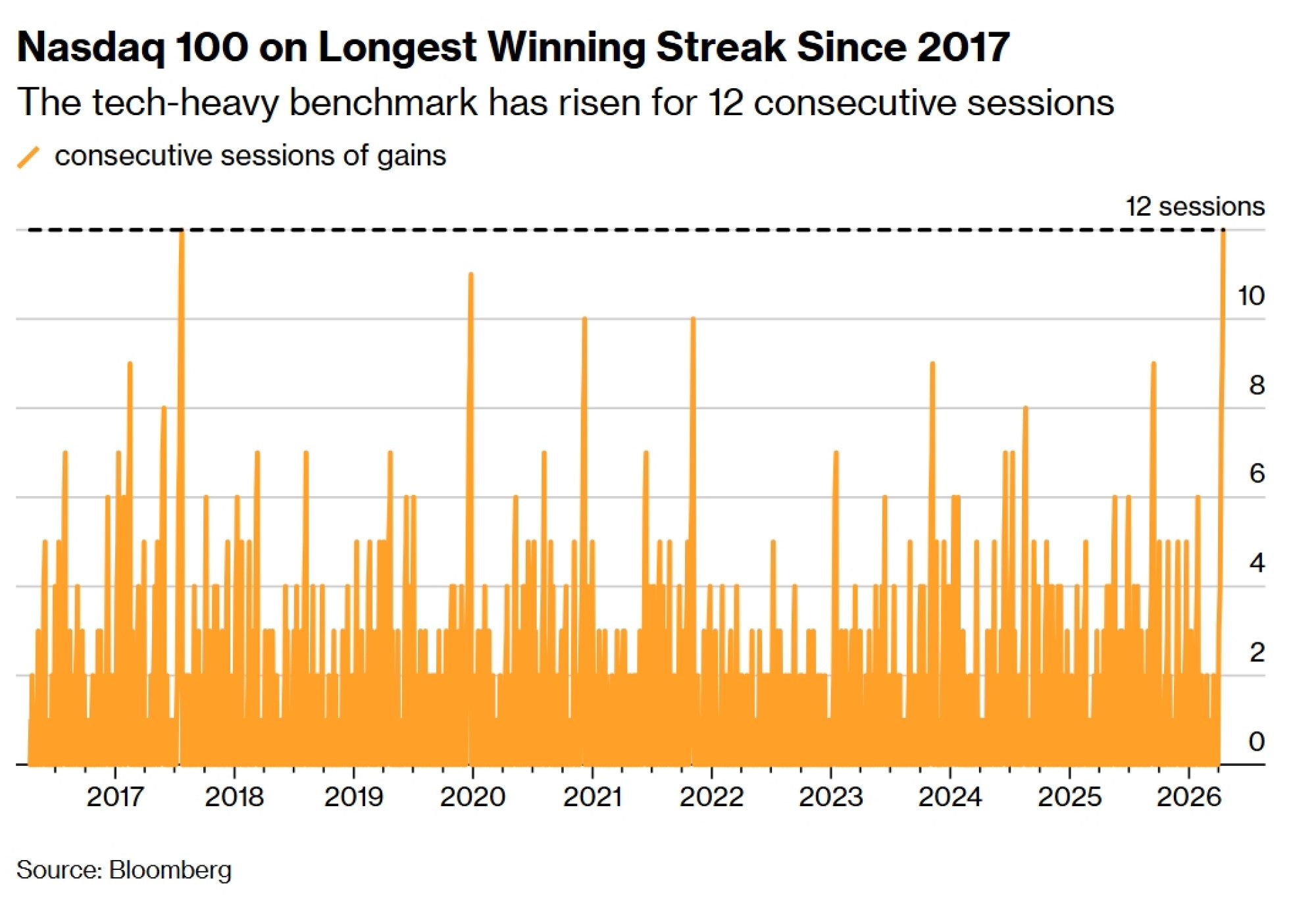 Iako je dvanaestodnevni pobjednički niz Nasdaqa pogurao indeks do novih povijesnih vrhunaca, valuacije tehnološkog sektora ostaju blizu svog desetogodišnjeg prosjeka. Procjene zarada rasle su usporedo s dionicama, držeći buduće omjere cijene i zarade (P/E ratios) na niskim razinama.