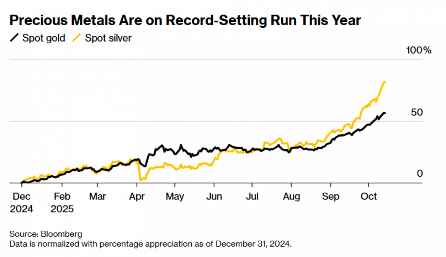 Četiri glavna plemenita metala porasla su između 56 posto i 81 posto ove godine, predvodeći rast na robnim tržištima. Rast zlata podržan je kupnjama središnjih banaka, povećanjem ulaganja u burzovno-trgovane fondove (ETF-ove) i smanjenjem kamatnih stopa američkog Fed-a. Potražnja za sigurnim ulaganjima dodatno je potaknuta ponovnim napetostima u trgovini između SAD-a i Kine, prijetnjama neovisnosti Fed-a i djelomičnim zatvaranjem američke vlade.