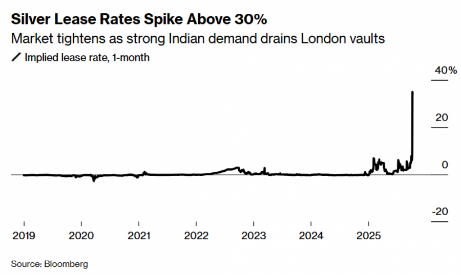 Stope najma srebra - koje predstavljaju godišnji trošak posuđivanja metala na londonskom tržištu - bile su stalno visoke ove godine, ali su u petak skočile na više od 30 posto na mjesečnoj osnovi. To stvara goleme troškove za one koji žele produžiti kratke pozicije. Nagli rast potražnje iz Indije posljednjih tjedana smanjio je opskrbu dostupnih poluga za trgovanje u Londonu, nakon što je početkom godine došlo do žurbe u slanju metala u New York zbog bojazni da bi SAD mogao uvesti carine, što je izazvalo velike poremećaje između dvaju trgovačkih središta.