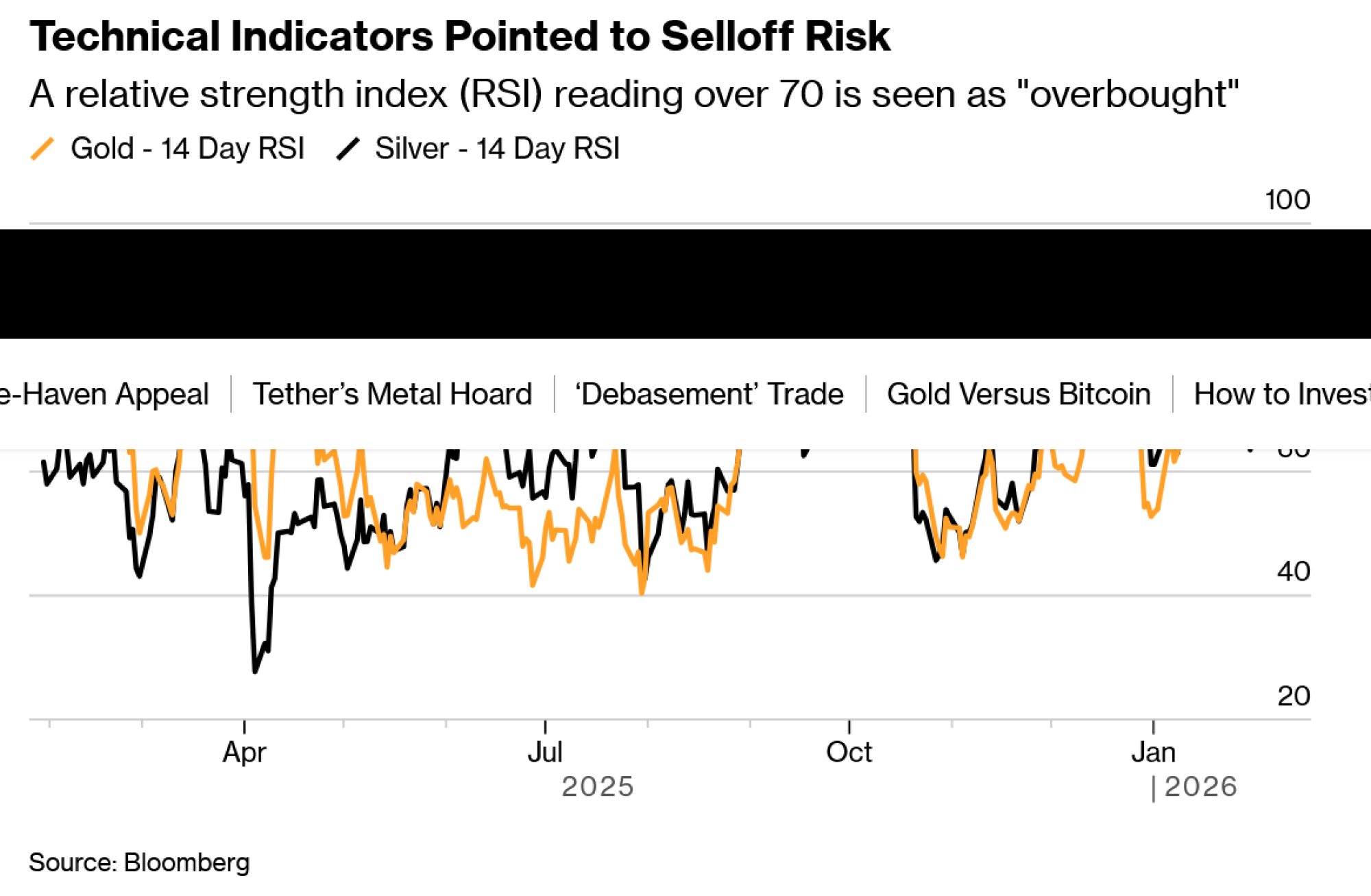 S obzirom na to da su cijene zlata i srebra ove godine već toliko porasle, neki tehnički pokazatelji dali su znakove upozorenja. Jedan od njih je indeks relativne snage (RSI), koji je posljednjih tjedana signalizirao da su oba metala možda prekupljena i da im slijedi korekcija. RSI za zlato nedavno je dosegao 90, najvišu vrijednost za plemeniti metal u desetljećima.