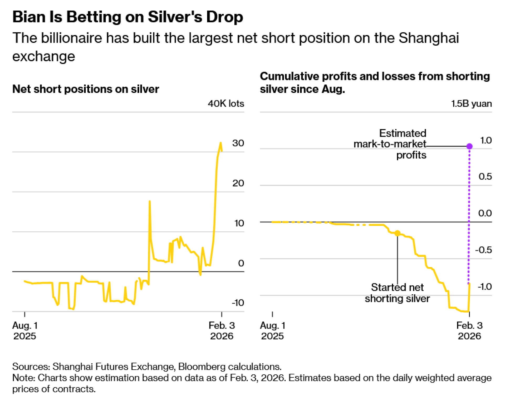 Bian je, putem svoje brokerske kuće Zhongcai Futures Co., počeo povećavati prodaju kratkih pozicija na srebro u posljednjem tjednu siječnja, prema podacima burze. SHFE ne navodi identitet pojedinačnih investitora koji stoje iza brokerskih računa, ali izvori kažu da Bianove vlastite oklade, i proizvodi kojima izravno upravlja za mali broj klijenata, čine većinu pozicija te tvrtke u plemenitim metalima.