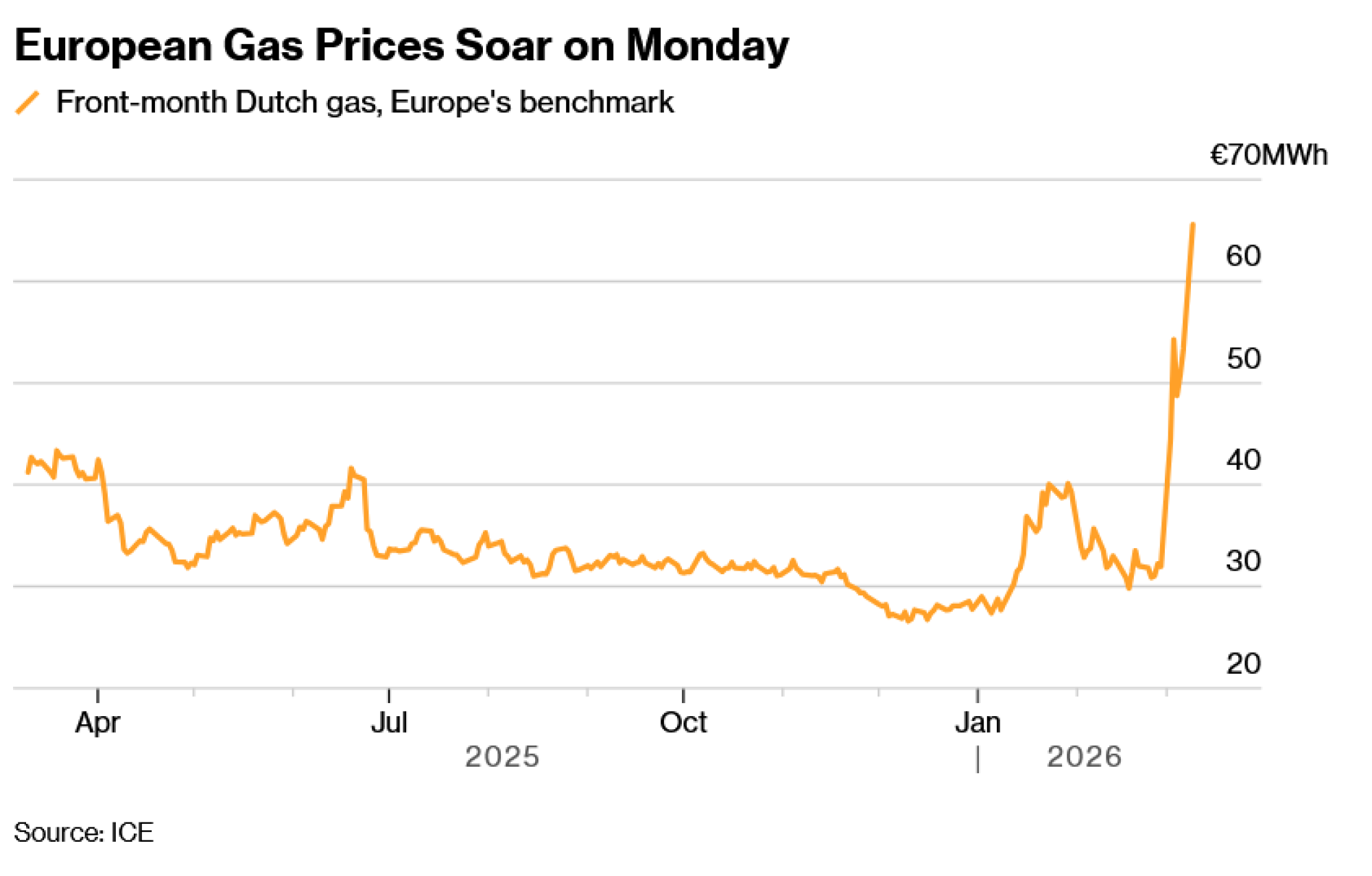 Referentni terminski ugovori porasli su u ponedjeljak za čak 30 posto, produživši svoj najveći tjedni rast od energetske krize. Taj potez uslijedio je nakon porasta cijene nafte na iznad 100 dolara po barelu, budući da je više velikih proizvođača s Bliskog istoka smanjilo proizvodnju, a Hormuški tjesnac ostao praktički zatvoren. Terminski ugovori na prirodni plin u SAD-u također su porasle, dosegnuvši najvišu razinu u mjesec dana.