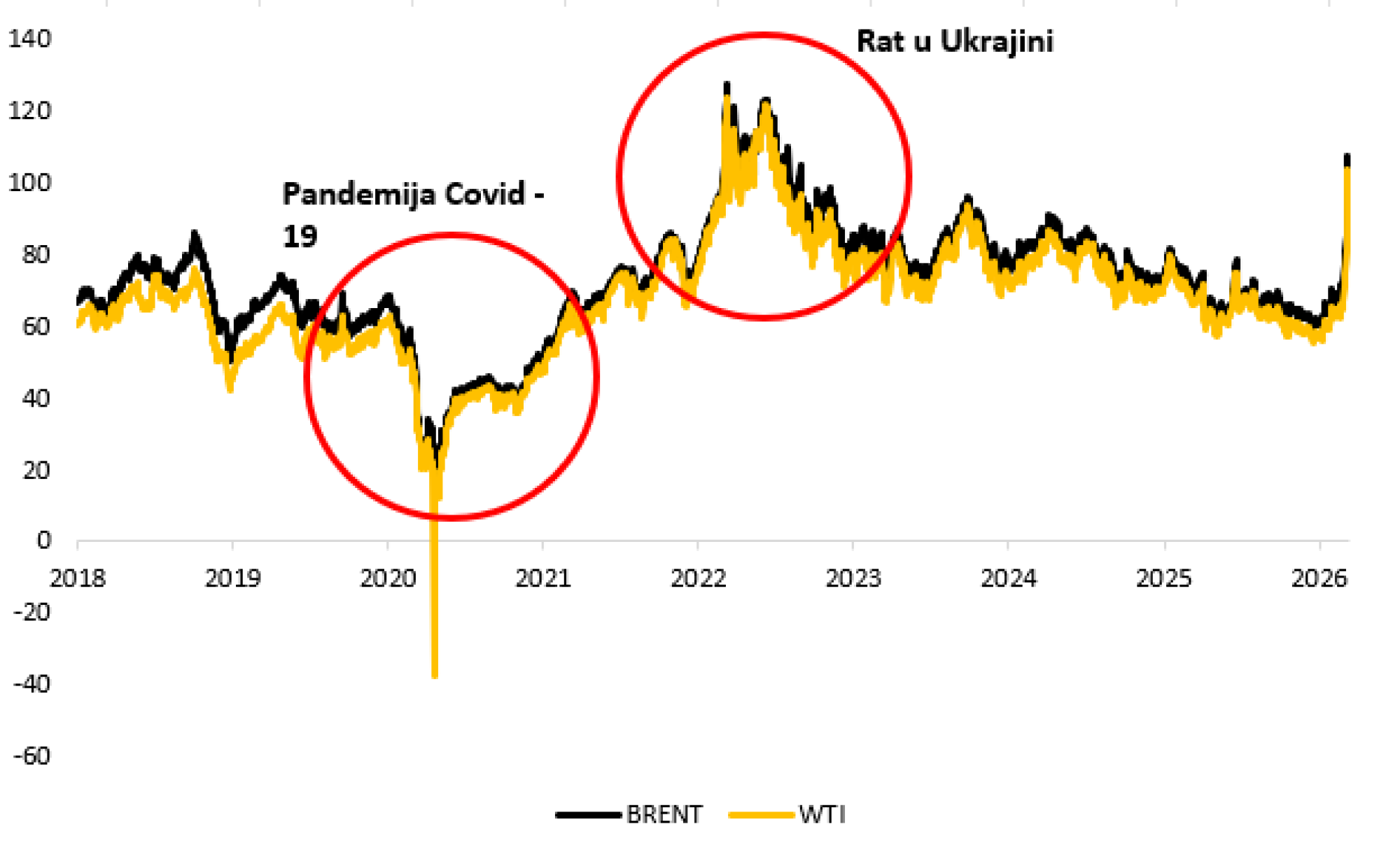 Kretanje cijena nafte u dolarima od 2018. do danas