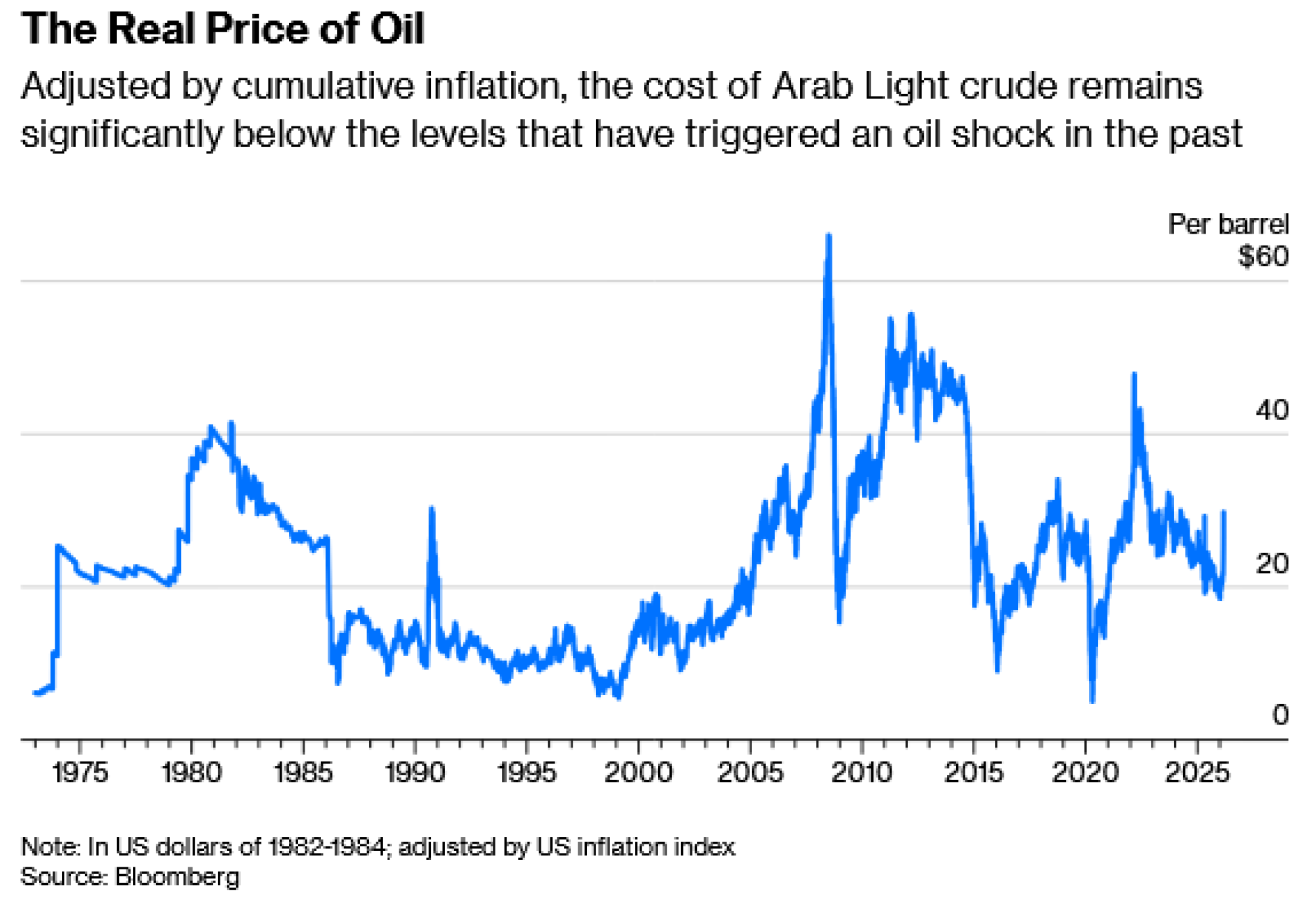Hoće li to uspjeti? U realnim okvirima, prilagođeno kumulativnom utjecaju inflacije, nafta je još uvijek znatno ispod prethodnih vrhunaca. Cijena od 139 dolara po barelu dosegnutih u ožujku 2022. godine nakon što je Rusija napala Ukrajinu iznosi oko 157 dolara u današnjem novcu. Cijena od 147,50 dolara po barelu iz srpnja 2008. godine ekvivalentna je iznosu od oko 205 dolara po barelu danas. Osim toga, utjecaj na cijene je do sada bio kratkotrajan, mjeren u danima, a ne mjesecima ili kvartalima.