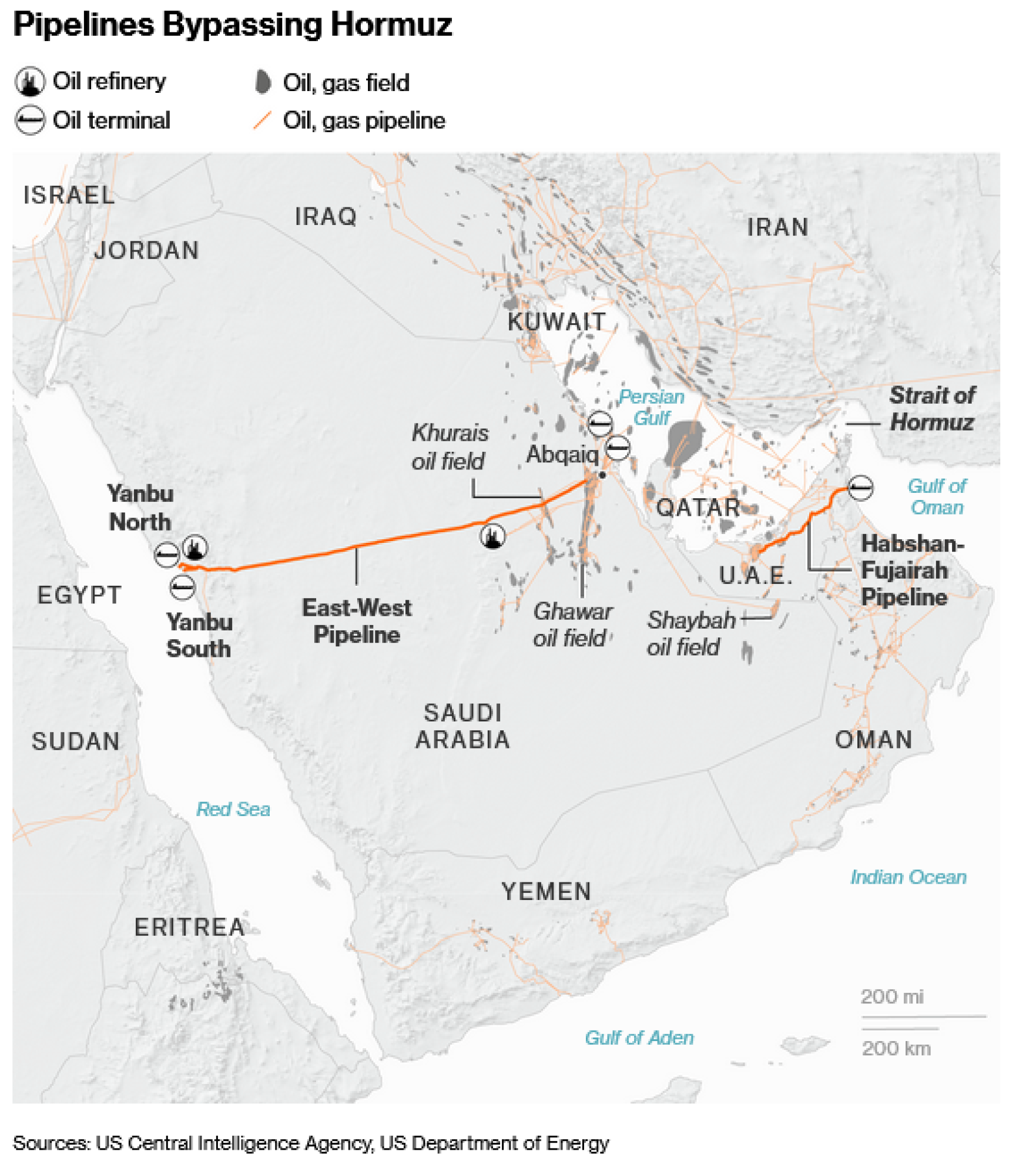 Tjesnac je usko grlo za oko 20 milijuna barela sirove nafte i derivata dnevno, što je jednako petini globalne potrošnje. Saudijski naftovod ne može ni približno nadoknaditi takav protok, ali može pružiti alternativu za čak pet milijuna barela dnevno. Drugi naftovod, u vlasništvu Ujedinjenih Arapskih Emirata, omogućuje zaobilaznu rutu prema Omanskom zaljevu za isporuku 1,5 milijuna barela. U hitnim slučajevima, UAE bi vjerojatno mogao povećati protok na blizu dva milijuna.