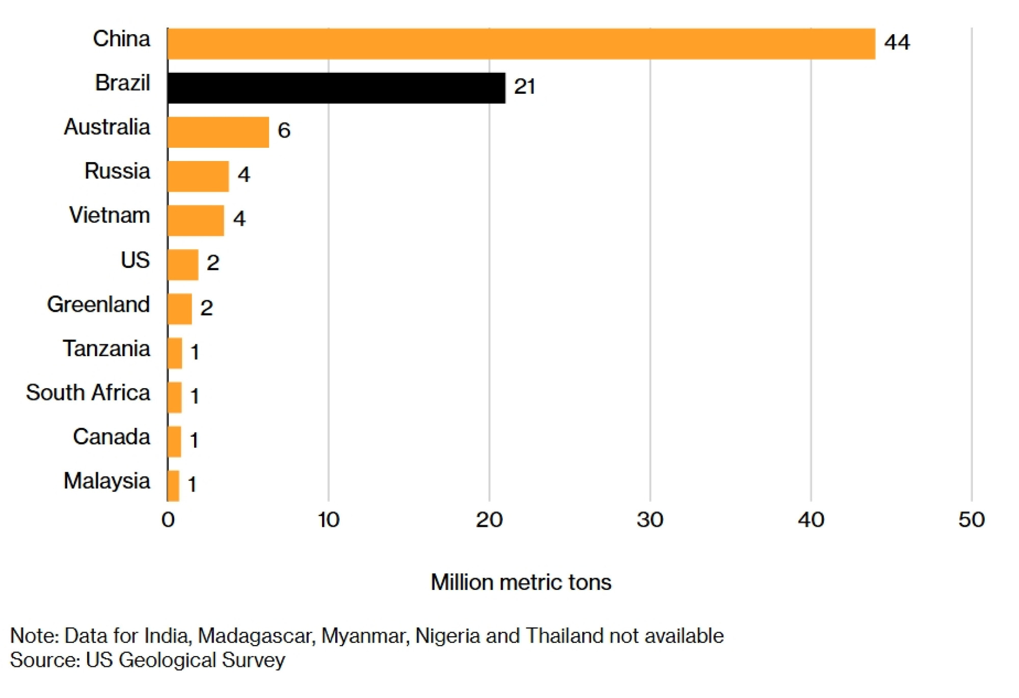 Rudarska proizvodnja Brazila prošle je godine iznosila svega 2000 tona, prema podacima USGS-a, što ga čini devetim najvećim proizvođačem na svijetu. Kina je, za usporedbu, proizvela 270.000 tona i bila je odgovorna za više od 60 posto globalne proizvodnje.