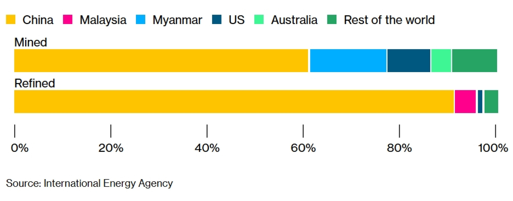 Azijska nacija još je dominantnija u rafiniranju rijetkih zemnih minerala u upotrebljivije, i vrjednije, oblike, dok Brazil ima minimalne kapacitete za preradu.