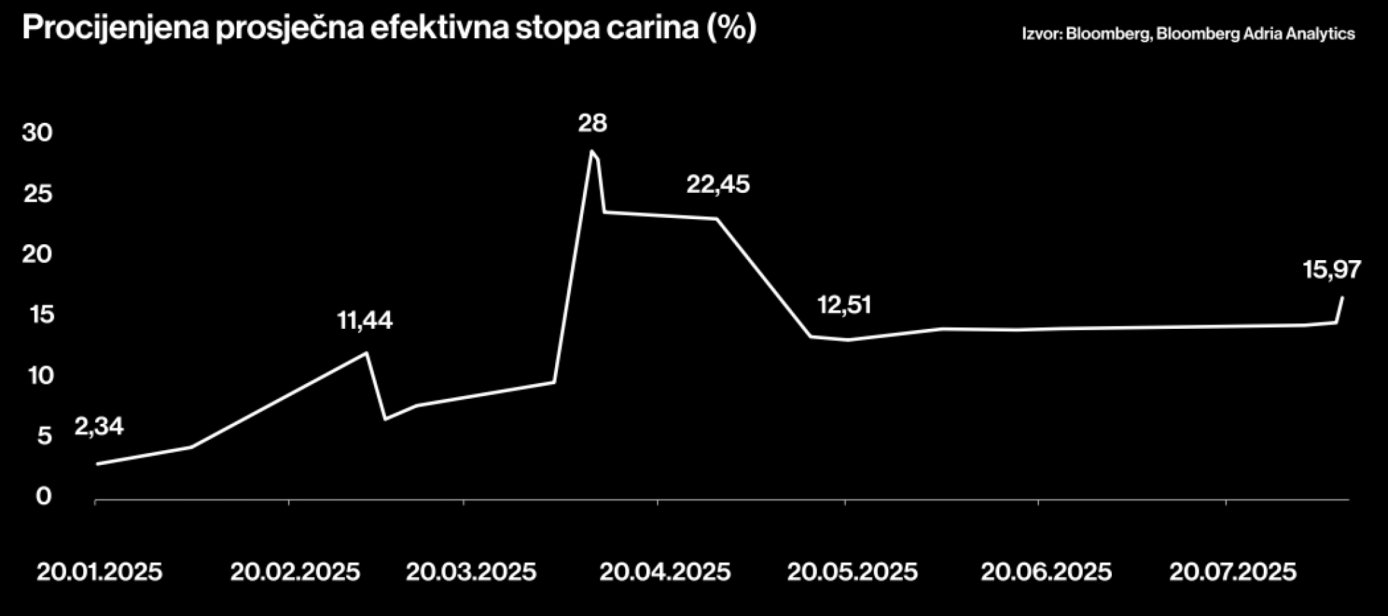 Kao najbitnije događaje izdvojio je Liberation day u aprilu, početak pauziranja carina Kini u lipnju, dogovor SAD-a s EU i Japanom u srpnju i dan kada je sud proglasio Trumpove carine neustavnima u kolovozu.