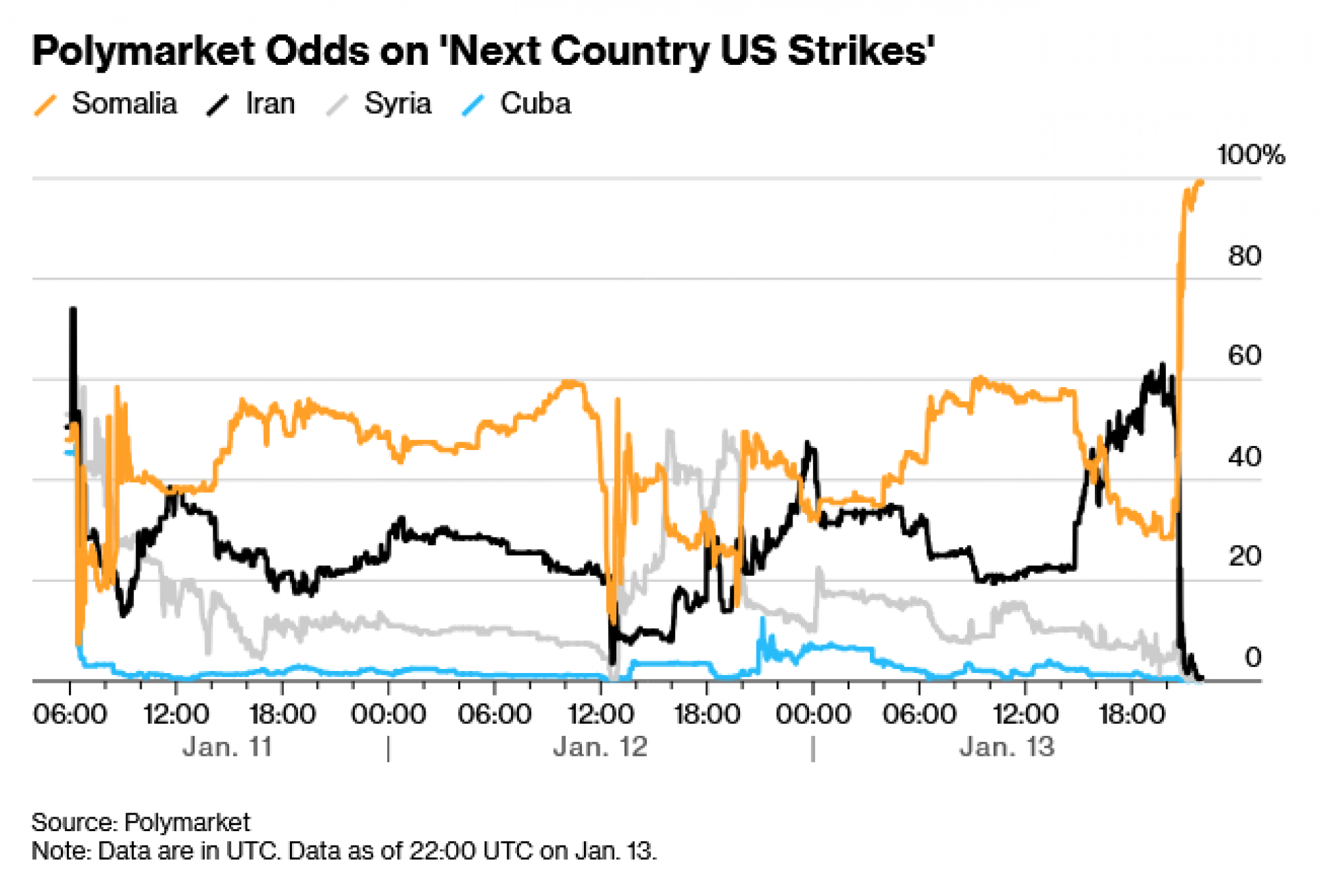 Iako neki od Polymarketovih konkurenata, poput Kalshija, dopuštaju klađenje na geopolitičke ishode, do sada su se suzdržali od bilo čega što se odnosi na vojnu akciju ili invaziju. Kalshijevi najbliži ekvivalenti tome uključuju ugovore o tome hoće li političari, u Sjedinjenim Državama i inozemstvu, biti izvan vlasti do određenog datuma.