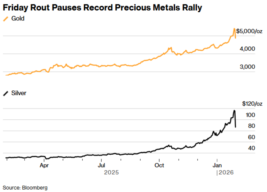 Zlato je palo više od 10 posto i probilo se ispod 5.000 dolara po unci, što je veći intradnevni pad od onih zabilježenih tijekom globalne financijske krize 2008. te najveći dnevni pad još od ranih 1980-ih. Srebro je potonulo više od 26 posto, što predstavlja rekordan intradnevni pad, dok se rasprodaja proširila i na šire tržište metala. Bakar je u Londonu pao 3,4 posto, povukavši se s rekordne razine dosegnute u četvrtak.
