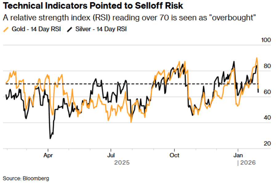 Nakon snažnog rasta cijena zlata i srebra ove godine, neki tehnički indikatori slali su upozoravajuće signale. Jedan od njih je indeks relativne snage (RSI), koji je posljednjih tjedana sugerirao da su oba metala postala prekupljena i zrela za korekciju. RSI zlata nedavno je dosegnuo razinu od 90, najvišu u desetljećima.